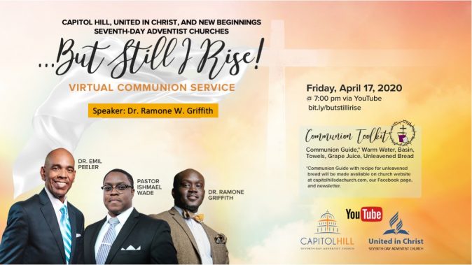 Friday, April 17 at 7 p.m., we will partner with New Beginnings to join Dr. Emil Peeler and the Capitol Hill SDA Church for virtual communion.